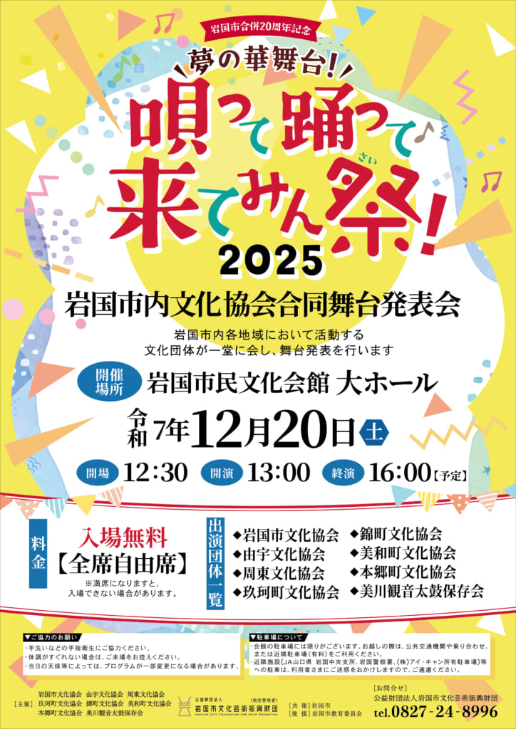 【出演予定団体】岩国市文化協会、由宇文化協会、周東文化協会、玖珂町文化協会、錦町文化協会、美和町文化協会、本郷町文化協会、美川観音太鼓保存会