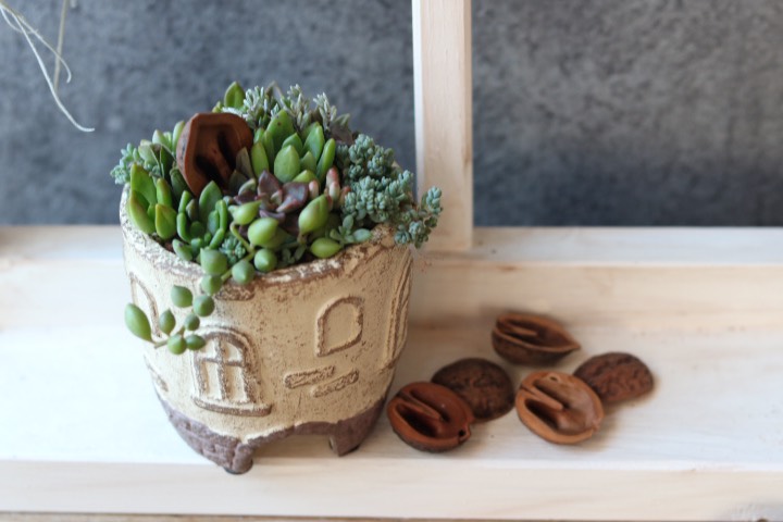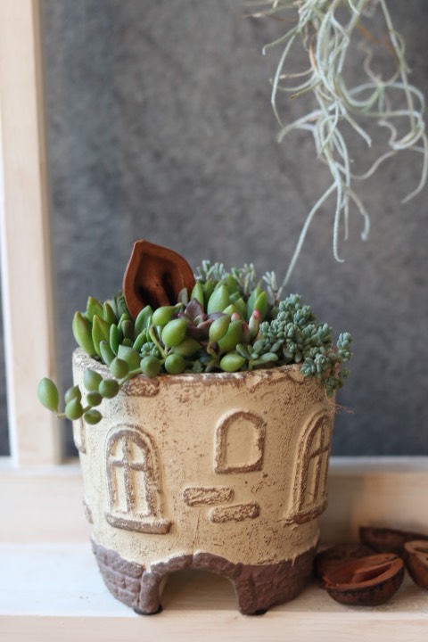 お気に入りの多肉を選んで、お家の形をした器にピンセットでギューっと詰め込んでonly oneの一鉢を作ります。